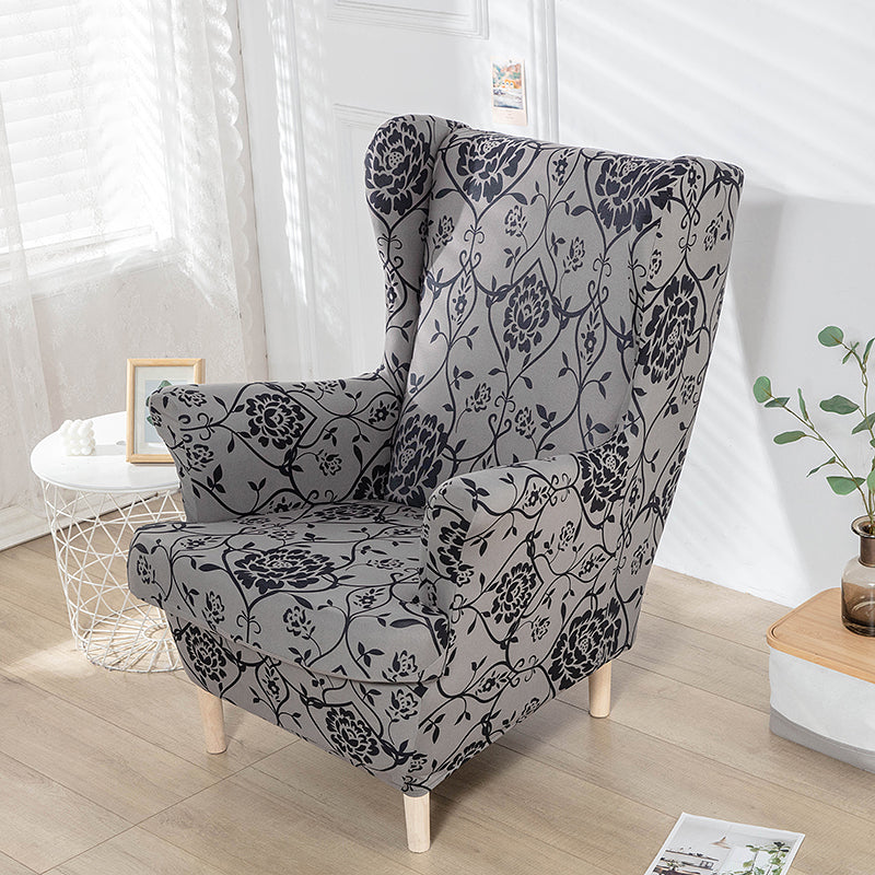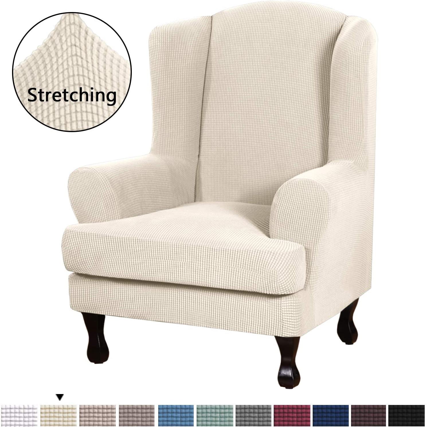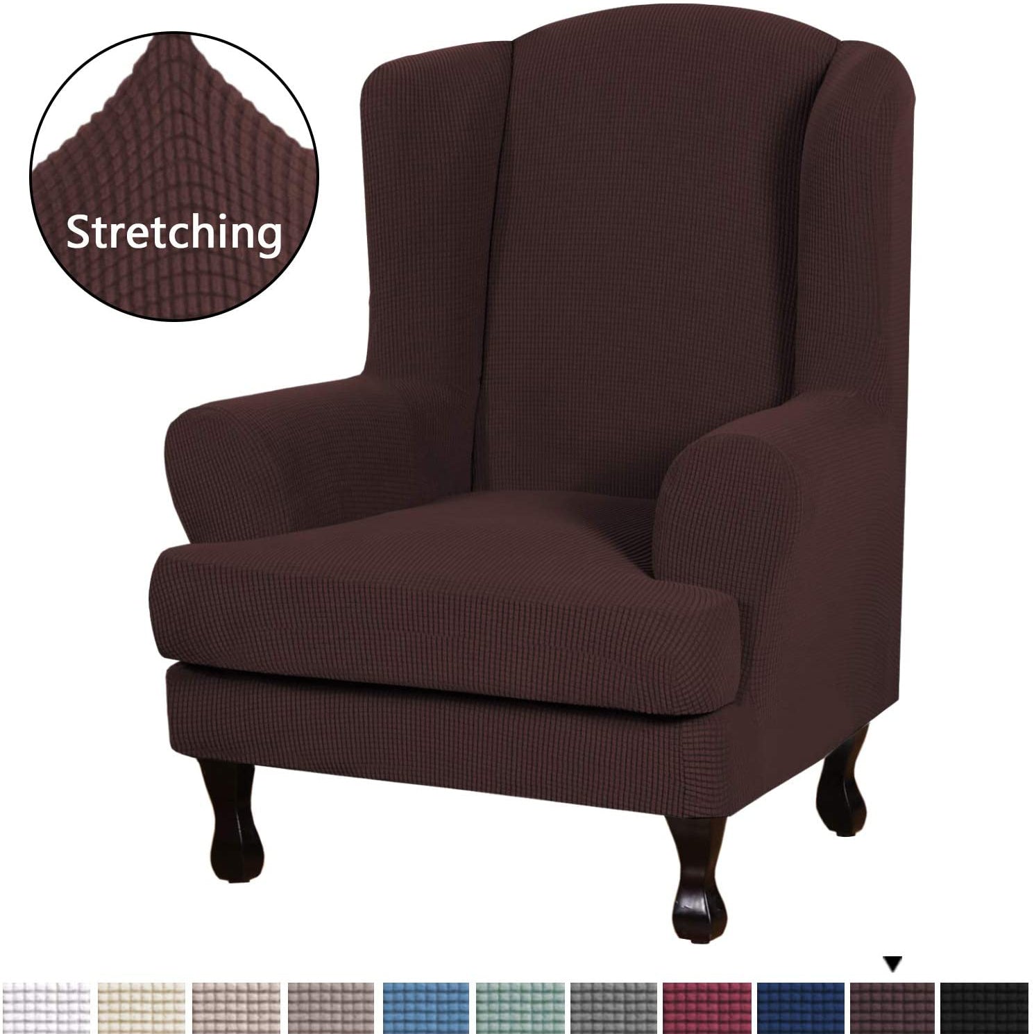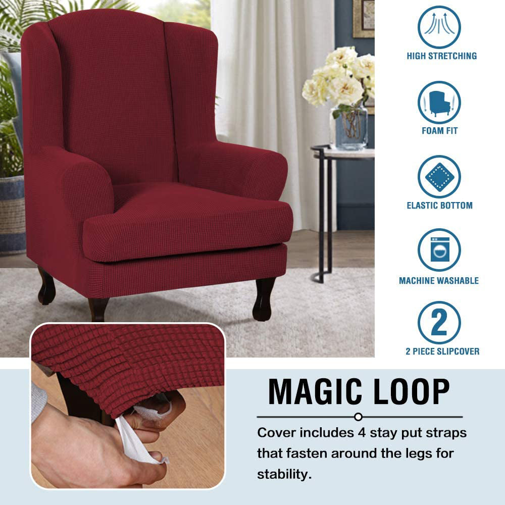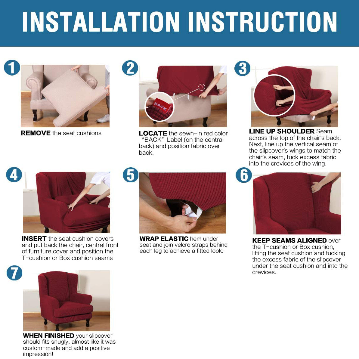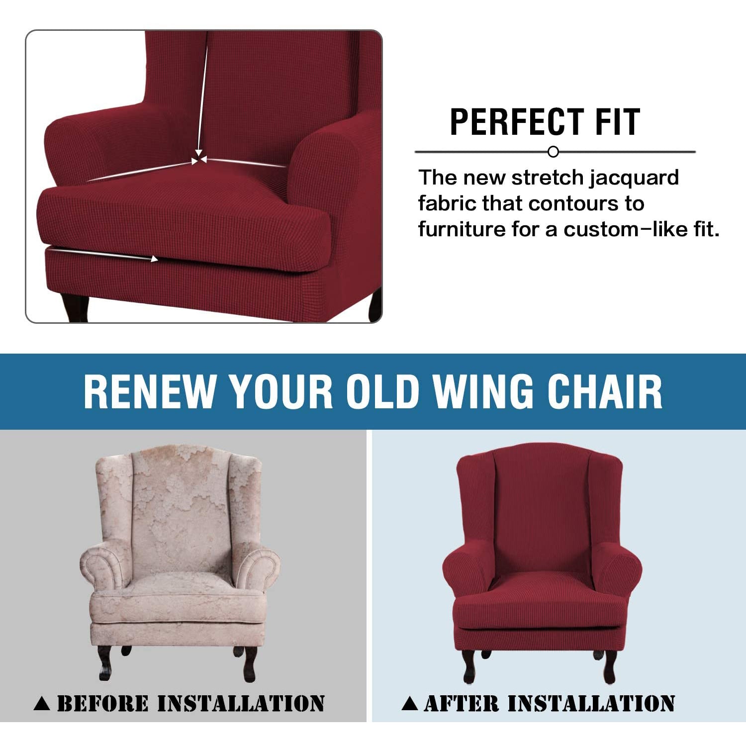 • GREAT FIT: This innovated 2 Pieces wing chair slipcover is crafted from durable and soft high stretch knitted jacquard fabric. Suitable for most standard wing chairs. Fit up to 26-32 inch seat wide and 45 inch tall. Best choice for T cushion and Box cushion styles