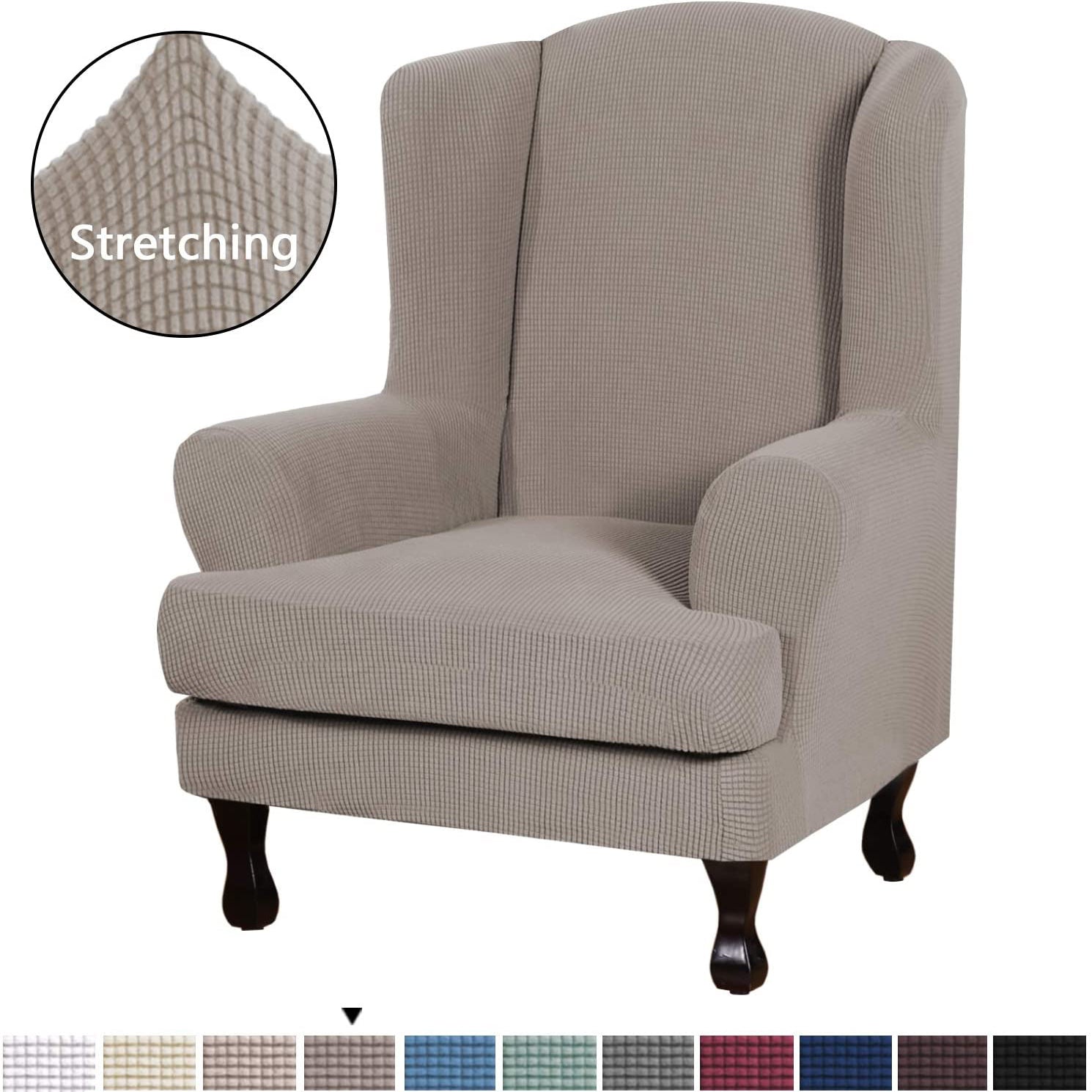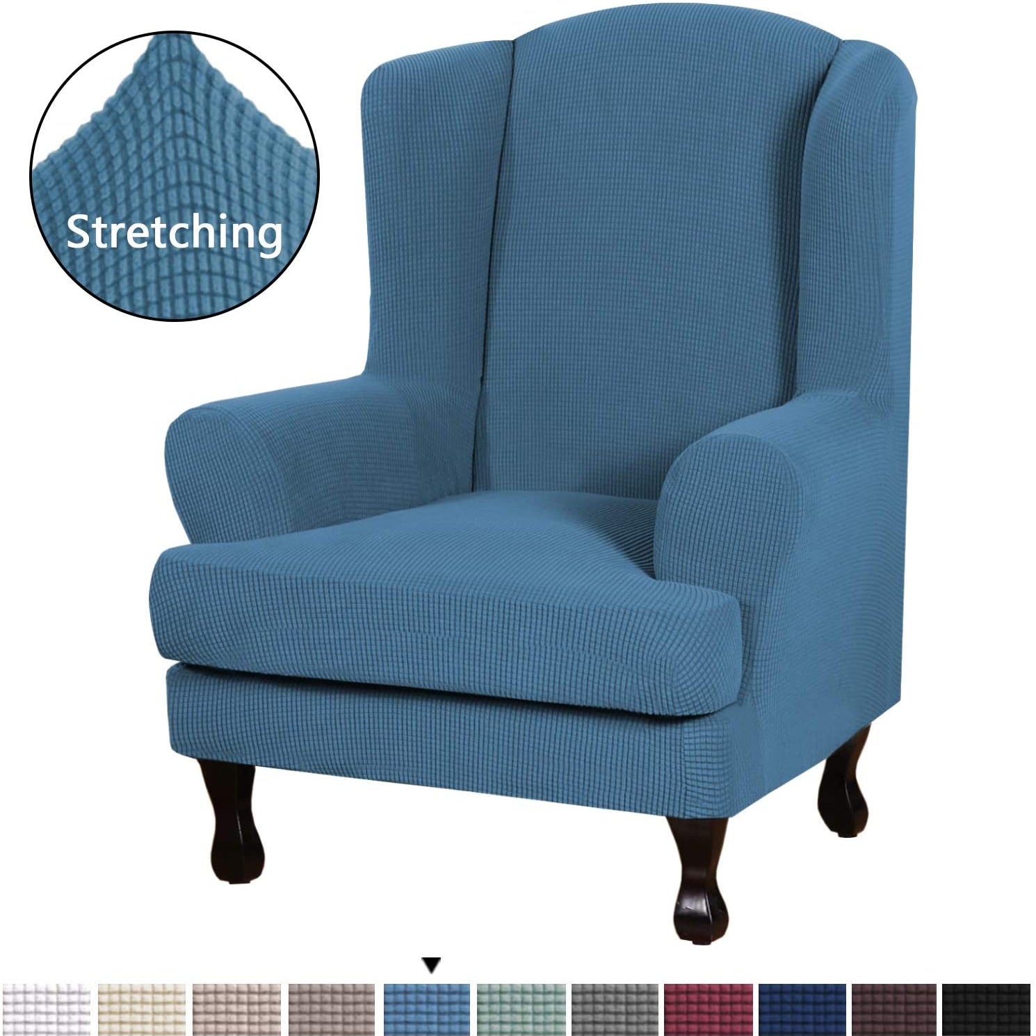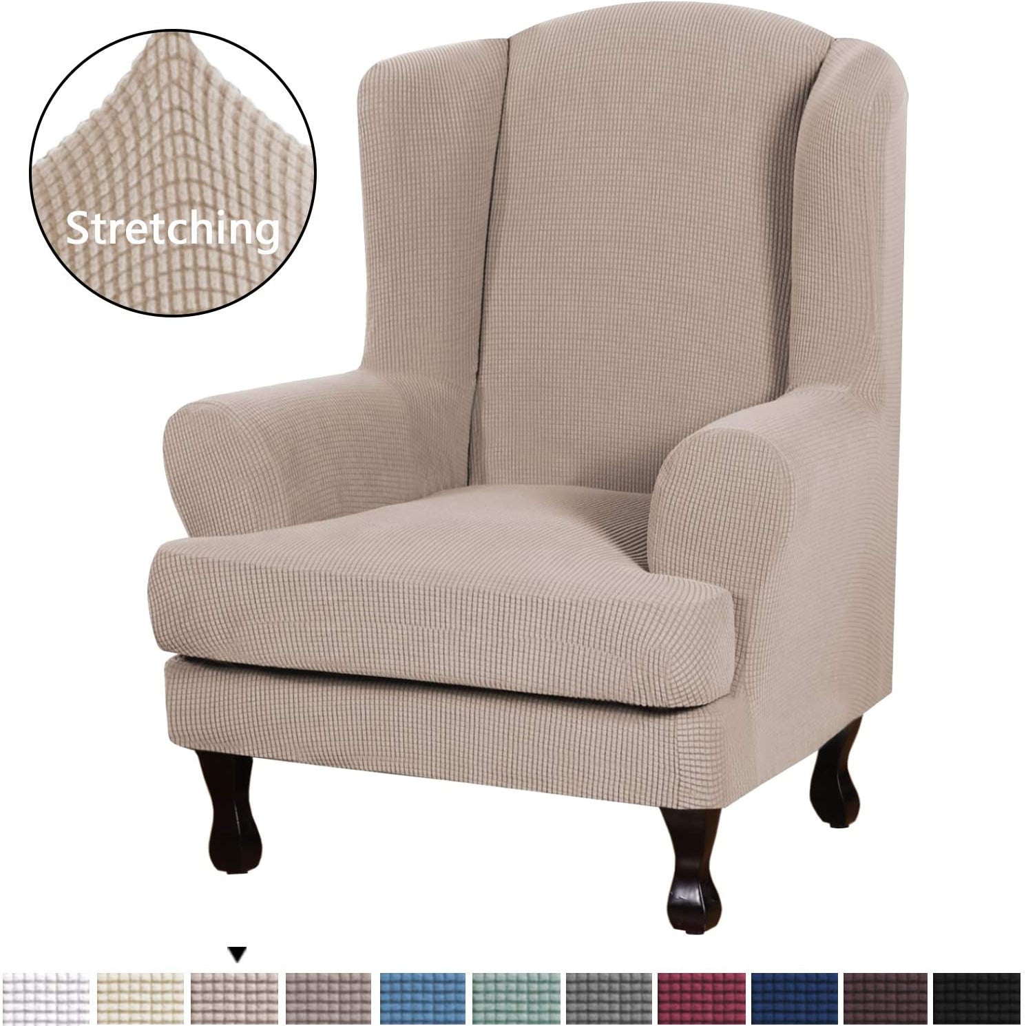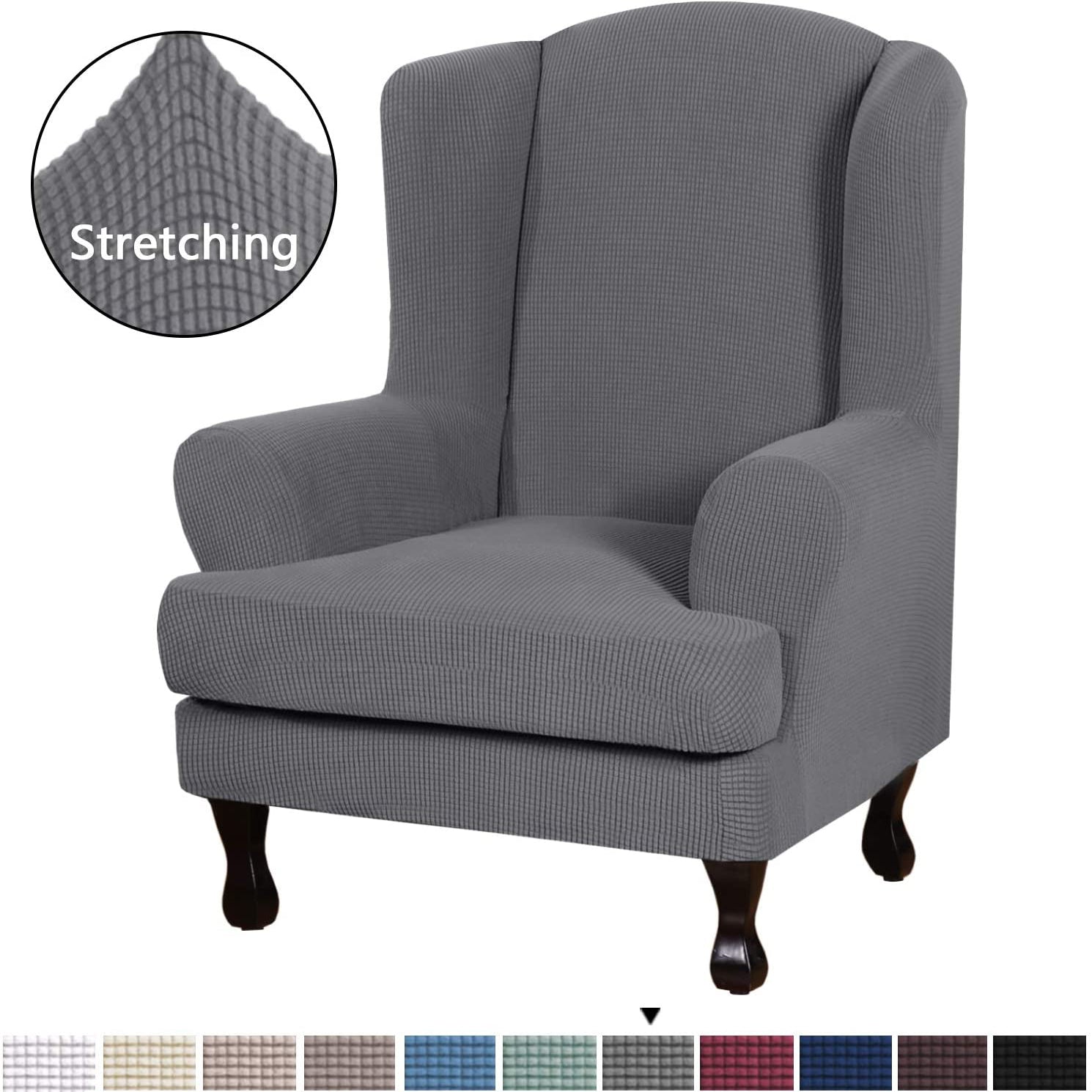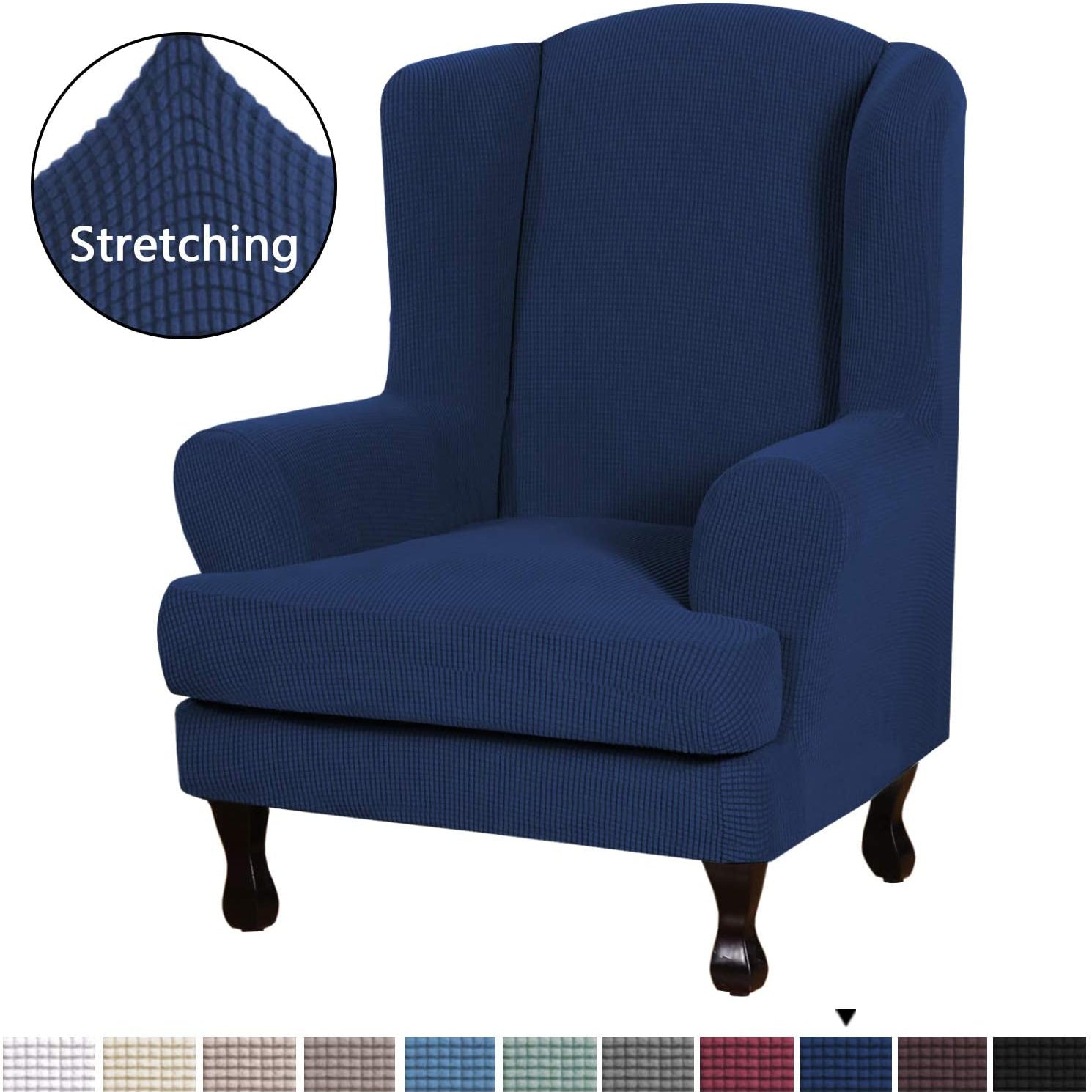 • GREAT FIT: This innovated 2 Pieces wing chair slipcover is crafted from durable and soft high stretch knitted jacquard fabric. Suitable for most standard wing chairs. Fit up to 26-32 inch seat wide and 45 inch tall. Best choice for T cushion and Box cushion styles