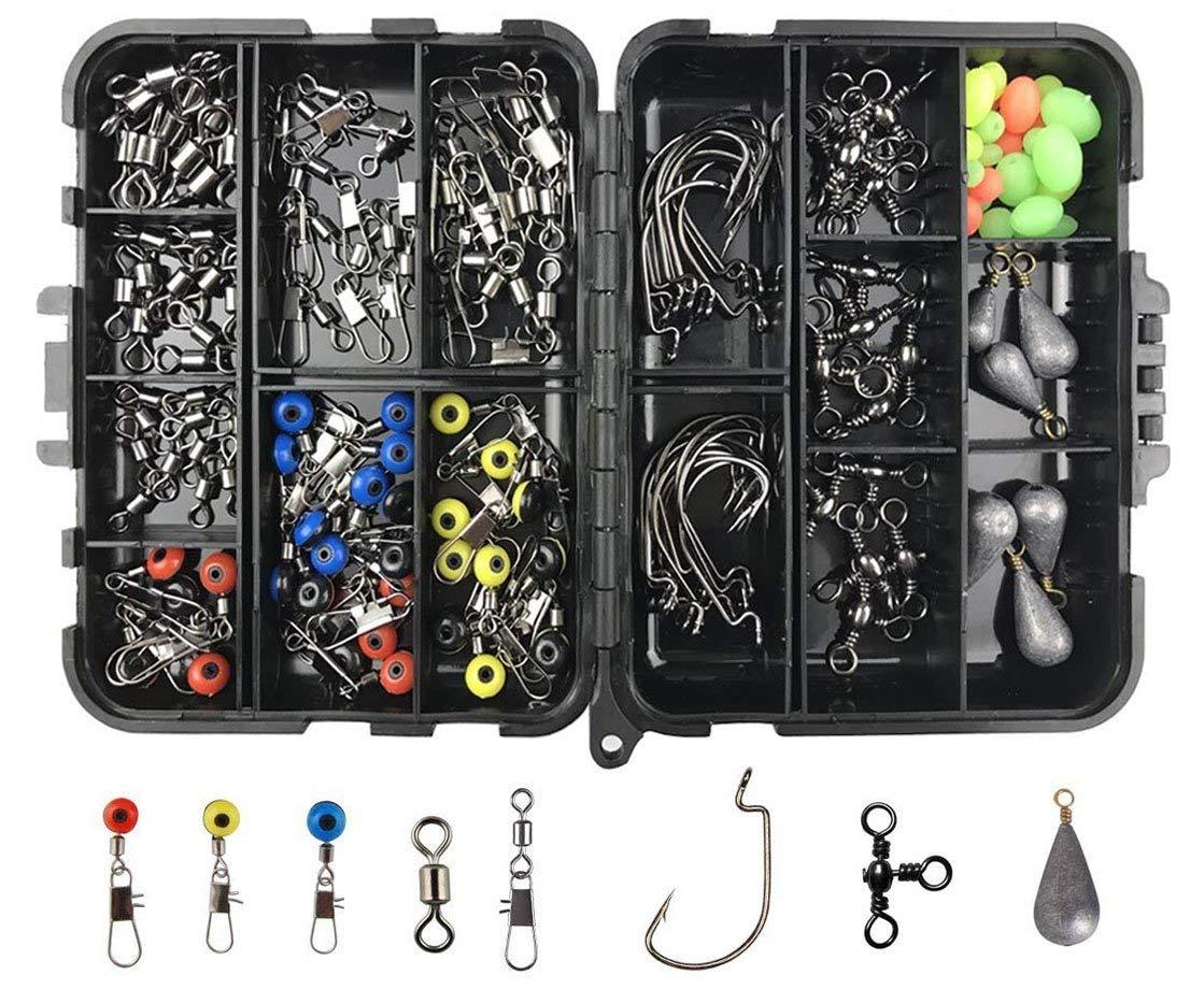 The fishing tackle box set comes with 160pcs/lot necessary fishing accessories:fishing hooks,bass casting weights sinker,rolling swivel with safety snap connector,rolling barrel fishing swivels,three way cross-line fishing swivels,fishing line to hook swivels shank clip connector and fishing beads