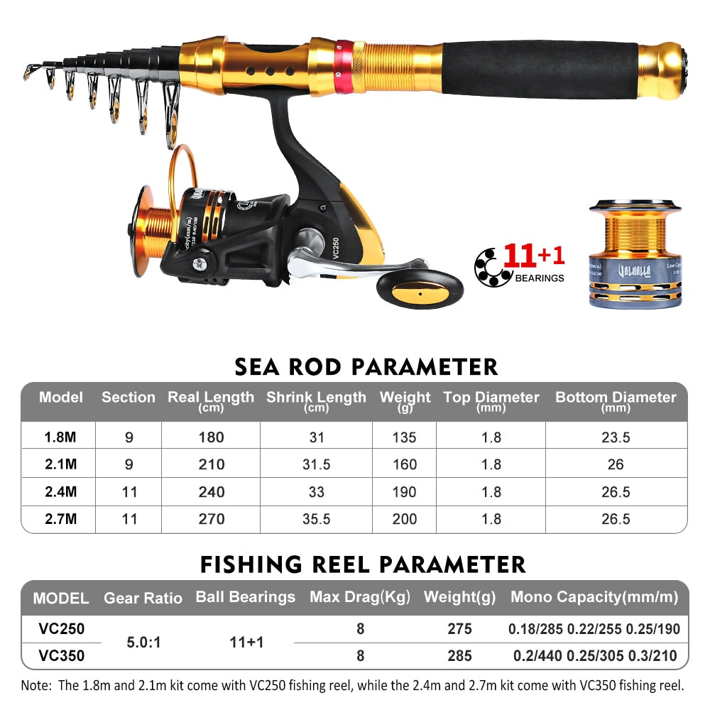 Note: The 1.8m and 2.1m kit come with VC250 fishing reel, while the 2.4m and 2.7m kit come with VC350 fishing reel.