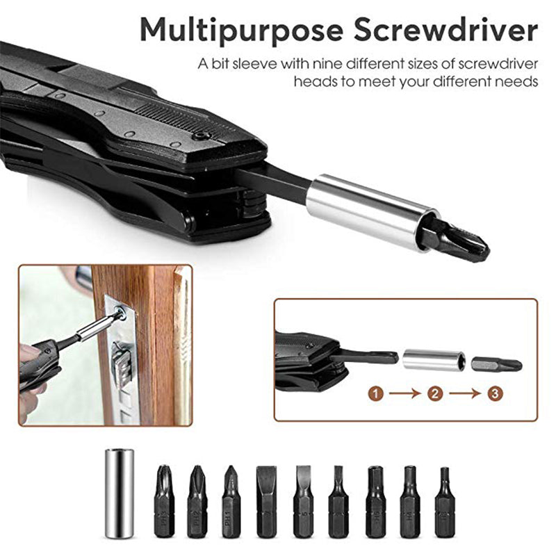 The core feature of this pocket-sized tool is the amount of functionality it has hidden on its sleeve. Use the Multi-Tool Pocket Knife 10-in-1 as nipper pliers, wire cutter, nut wrench jaw, cutter, toothed cutter, bottle opener, can opener, straight screwdriver, screw bit connector, and folding pliers handle all in one.