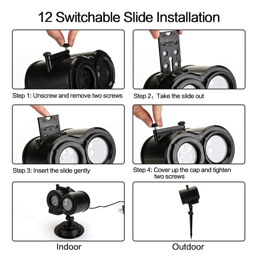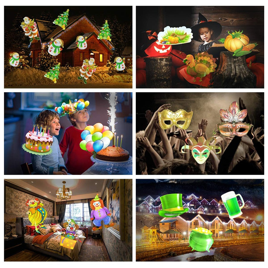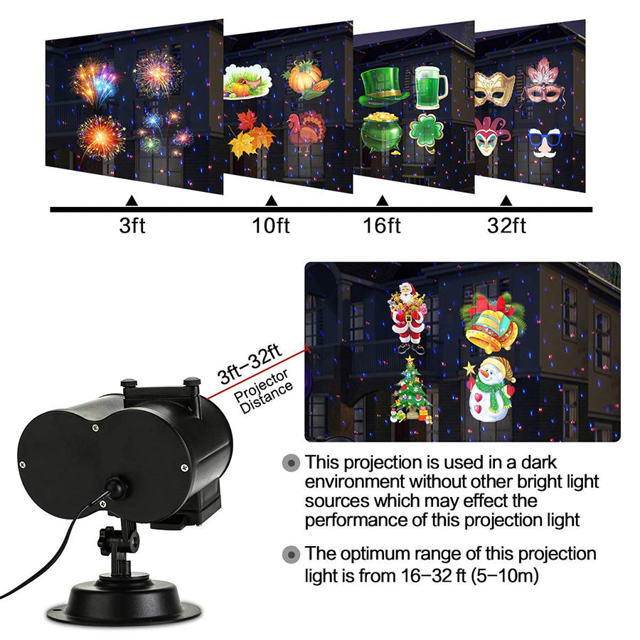 ◆ This Projector lights is up to 12 Pattern Slides, Perfect for Christmas decoration. Including Christmas Tree/Santa, Halloween, Thanksgiving Day, Snowflake, Love, Skeleton, Birthday Cake, Heart Shape and so on. It is suitable for house indoor or outdoor.