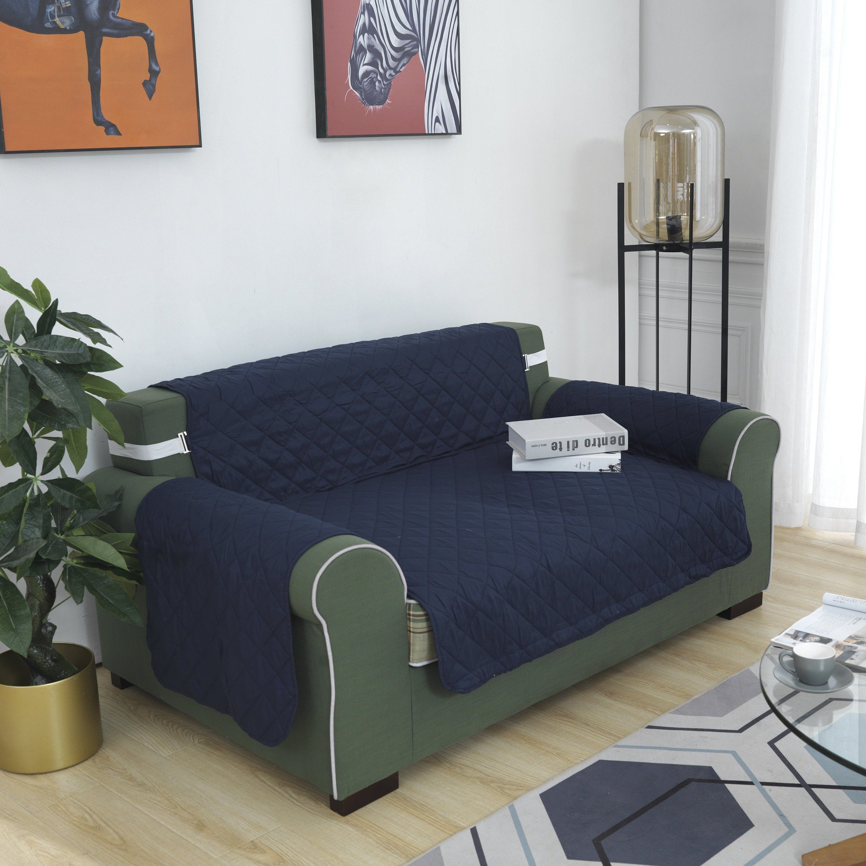 This cover was easy to put on - I didn't need the straps at all - and does the job of covering my sofa so my dog can sit next to me. I was using a blanket, but it didn't stay put and didn't look very good. I purchased the navy blue because my sofa is blue and white stripes. It looks great, but I didn't consider the fact that my dog is primarily WHITE. The hair really shows! I may go back and purchase another in a lighter color, but I'll see how this one does over time first. For the price, I don't think you can go wrong. It seems to stay put very well and looks attractive. I haven't washed it yet, but it seems like it would wash up fine. Will report back if I'm disappointed after laundering.