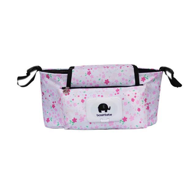 Our Stroller Pouch is a convenient carrying case for all of your baby's essentials. The pouch hangs from your stroller and has plenty of storage space for wipes, diapers, bottles, sippy cups, and more!