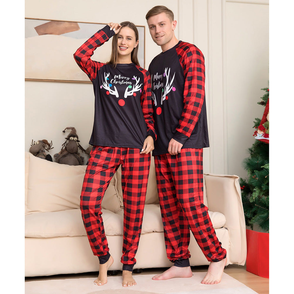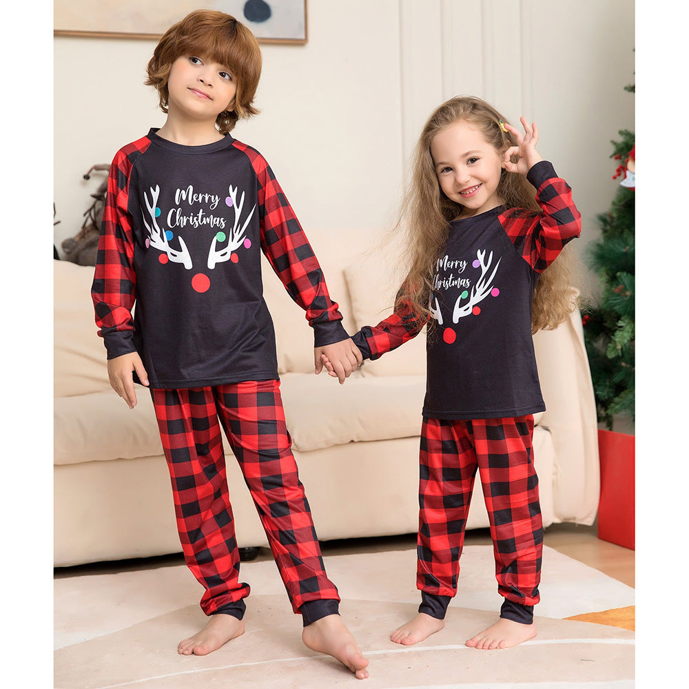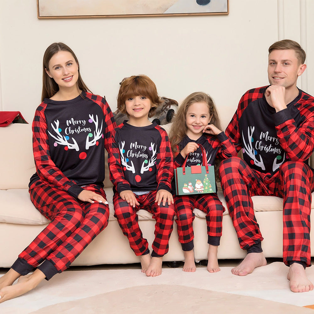 Merry Christmas Elk Antlers Plaid Print Christmas Family Pajamas