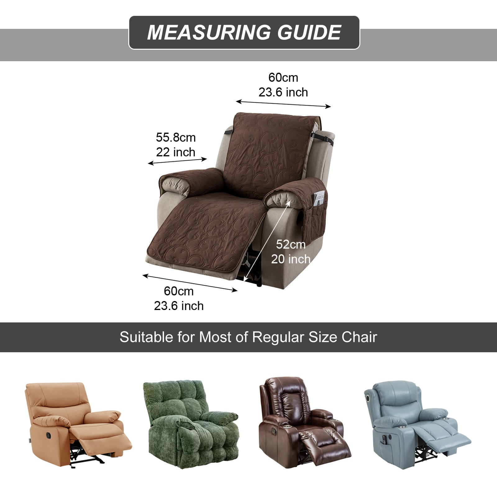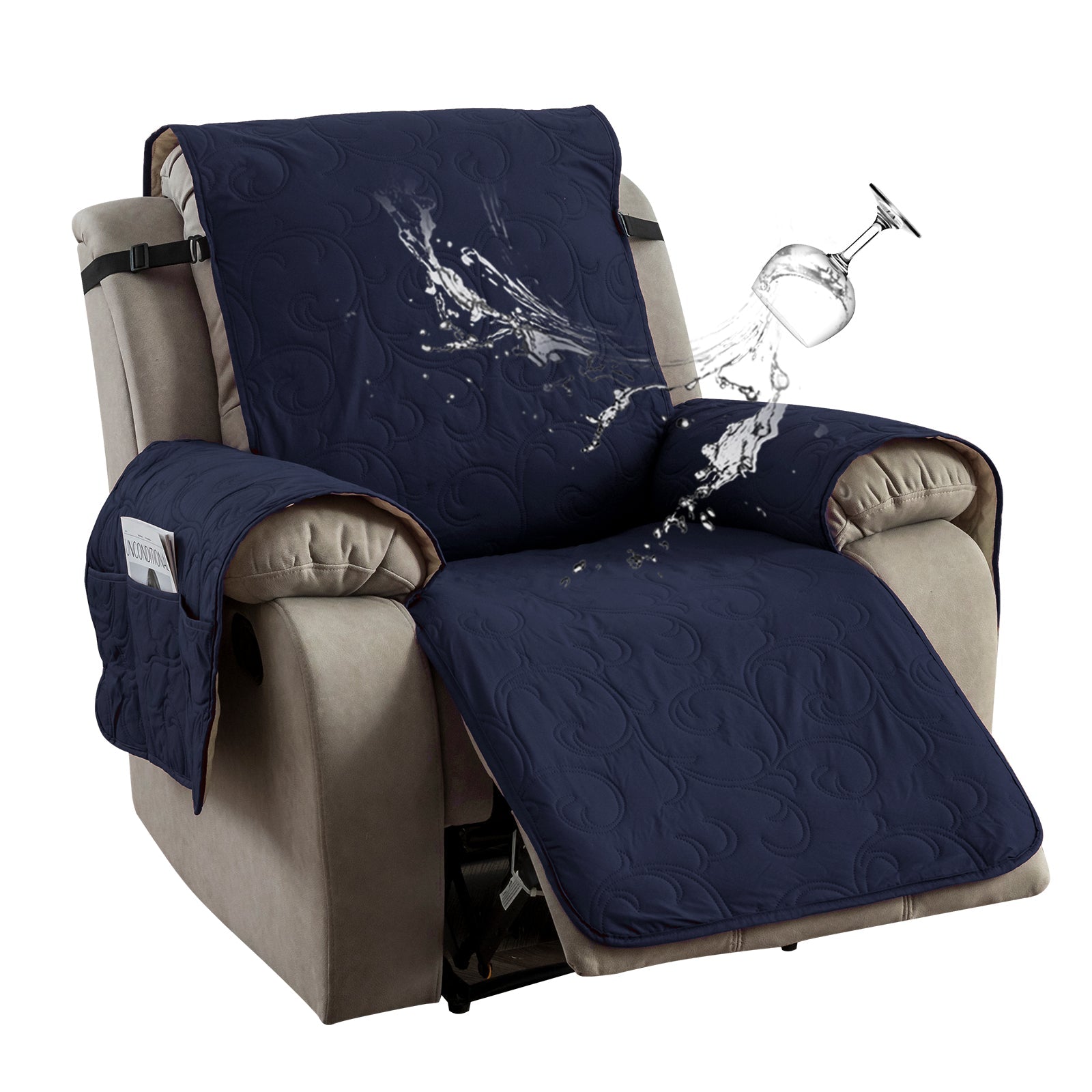 The recliner cover has a storage bag design on the arm, which can be used to store magazines, remote controls and other items.