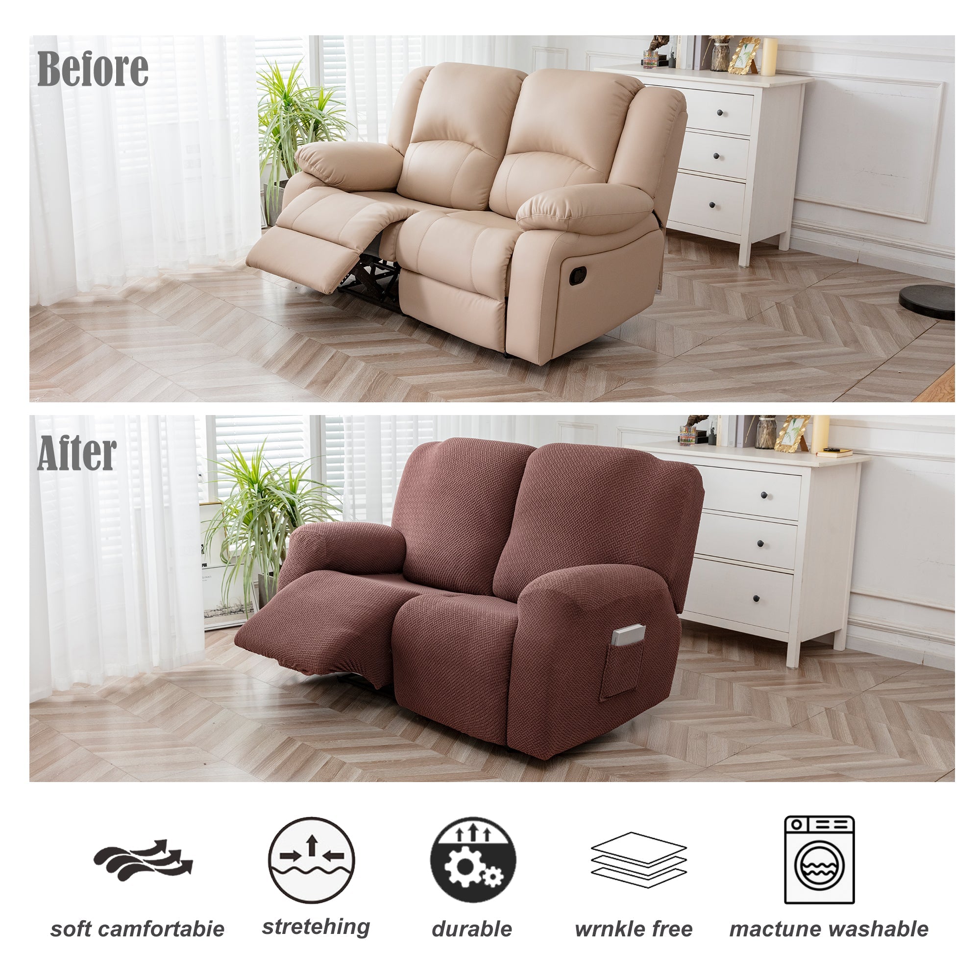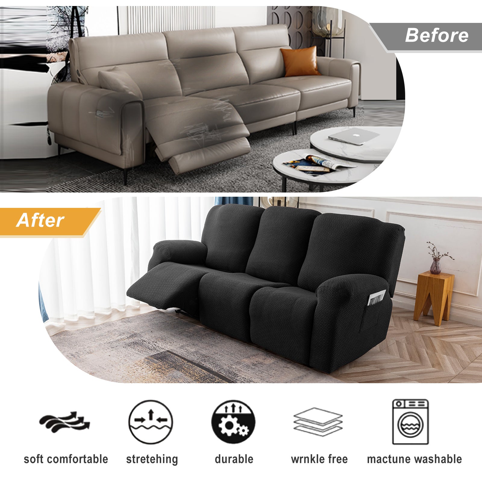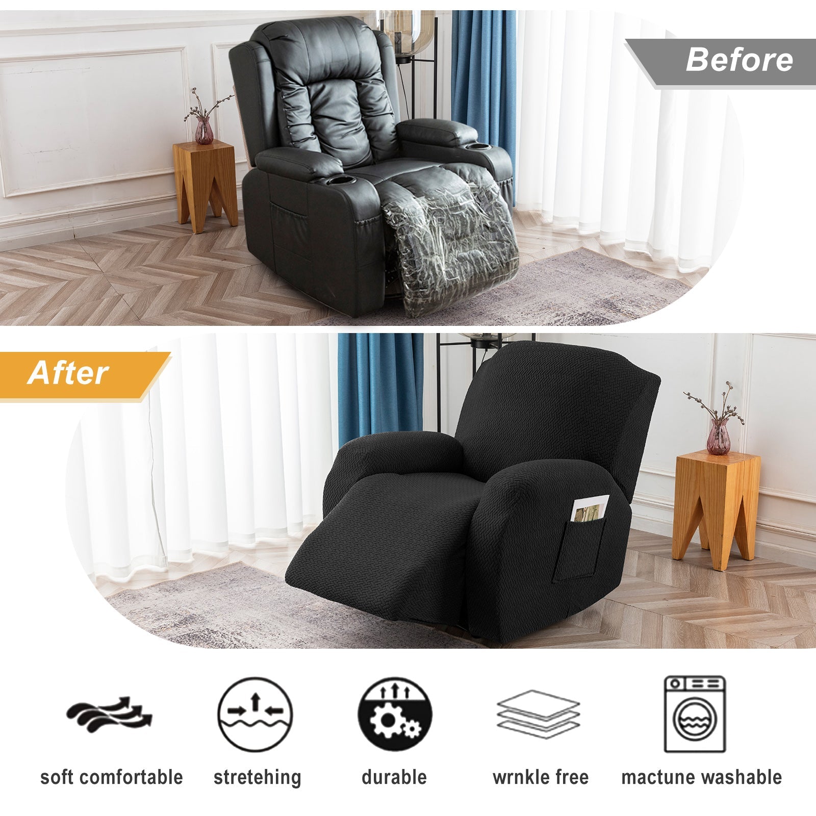 The recliner chair cover is made of durable and high-durable jacquard knit fabric that is soft and comfortable. Protect your chairs from stains, spills, scuffs and scratches.
