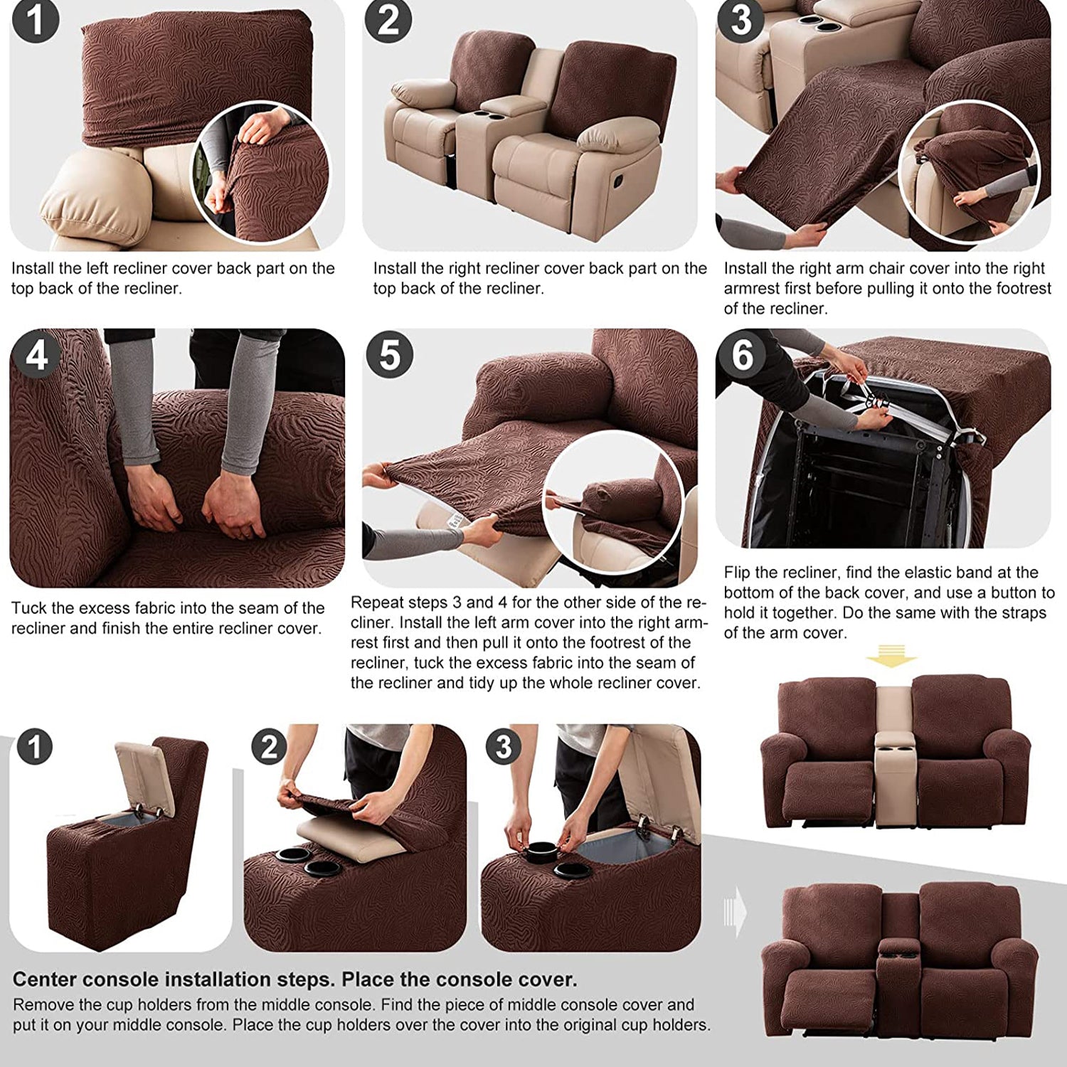 5. Repeat steps 3 and 4 for the other side of the recliner. Install the left arm cover into the right armrest first and then pull it onto the footrest of the recliner, tuck the excess fabric into the seam of the recliner and tidy up the whole recliner cover.